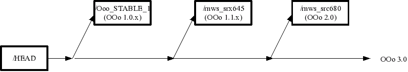 In the OpenOffice.org environment these branches are often called codelines or master(-branches). Builds on these codelines does not happen continuously (daily builds) but within regular milestones. For the 1.1.x codeline this result in a cvs branch tag called mws_srx645 which represents the latest status of this codeline and several more tags which represent a specific milestone on this codeline (SRX645_m34, SRX645_m40). The same scheme applies to the 2.0 codeline (mws_src680 for the latest status, SRC680_m36 for a specific milestone). Usually every week there will be a new milestone on the active development line available. There is also the possibility to achieve some more granularity with the introduction of steps, so that more than one build per week is possible (SRC680_m33s1).